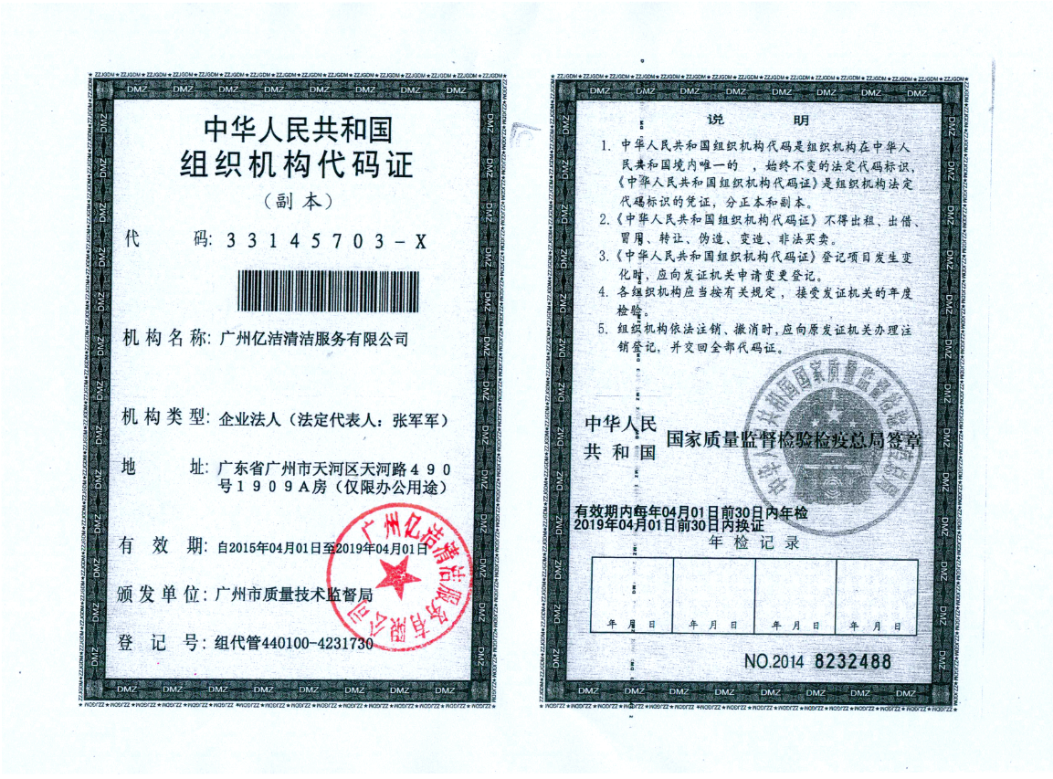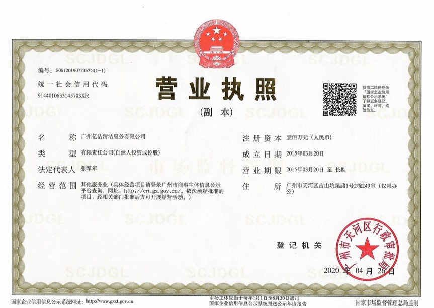 廣州億潔清潔服務(wù)有限公司是經(jīng)廣州市工商行政管理局批準(zhǔn)成立的(注冊(cè)資本:100萬元人民幣)。具有獨(dú)立法人資質(zhì)。公司成立2015年,公司具備完善的管理體系和高素質(zhì)管理隊(duì)伍,擁有特種技術(shù)人員33名,保潔服務(wù)人員上萬名,覆蓋廣州市,能及時(shí)調(diào)配并快速投入高效運(yùn)行。我們的每個(gè)員工都經(jīng)過公司的嚴(yán)格篩選,嚴(yán)格培訓(xùn),定期培訓(xùn)后持證上崗以保證服務(wù)品質(zhì),保障客戶的權(quán)利,利益,形象等不受損失。 廣州億潔清潔公司是一家設(shè)備齊全,技術(shù)強(qiáng)大的綜合型清潔服務(wù)公司,為客戶提供完善服務(wù)尊定了堅(jiān)定的基礎(chǔ)。 司于2010年全面推行了ISO9001質(zhì)量管理體系認(rèn)證和ISO14001國(guó)際環(huán)保體系認(rèn)證。先后獲得廣州高層建筑外墻清洗維修作業(yè)【安全資質(zhì)證書】、【廣州環(huán)衛(wèi)企業(yè)等級(jí)證書C級(jí)資質(zhì)】、廣州疾控中心頒發(fā)的【四害消殺服務(wù)資質(zhì)證】、【空氣治理A級(jí)資質(zhì)】、中國(guó)石材協(xié)會(huì)頒發(fā)的【石材資質(zhì)B級(jí)資質(zhì)】等。 廣州億潔清潔服務(wù)有限公司致力于打造專業(yè)、實(shí)惠、靠譜的保潔服務(wù)公司,把專業(yè)的事情交給專業(yè)的我們,您放心! 億潔清潔服務(wù)項(xiàng)目: 廣州保潔服務(wù):新建樓宇、別墅、酒店、醫(yī)院、辦公樓、賓館、企事業(yè)單位廠房竣工后開荒及裝修后精細(xì)保潔.工程保潔服務(wù)。 廣州物業(yè)托管:為廣州市各大企事業(yè)單位、賓館、政府機(jī)關(guān)、小區(qū)物業(yè)、酒店及廠房提供專業(yè)化保潔、園林、設(shè)施維護(hù)等管理服務(wù)。 廣州高空作業(yè):高空玻璃幕...[詳情]